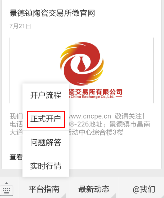 2、持有平安銀行卡或已開(kāi)通平安易寶用戶(hù)請(qǐng)進(jìn)入微信公眾號(hào)(景德鎮(zhèn)陶瓷交易所有限公司),在底部找到‘平臺(tái)指南->正式開(kāi)戶(hù)’: