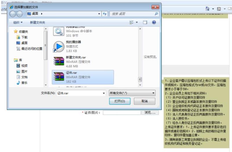 步驟二:點擊“瀏覽”,上傳證件圖片,圖片格式需以壓縮包形式上傳,壓縮包格式為rar或zip文件,要求小于等于5M,如圖: