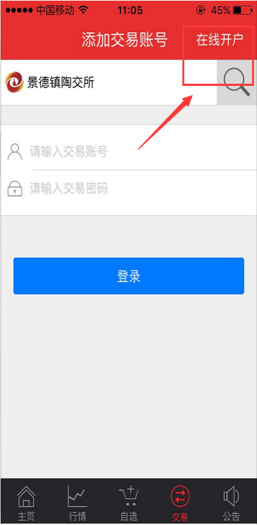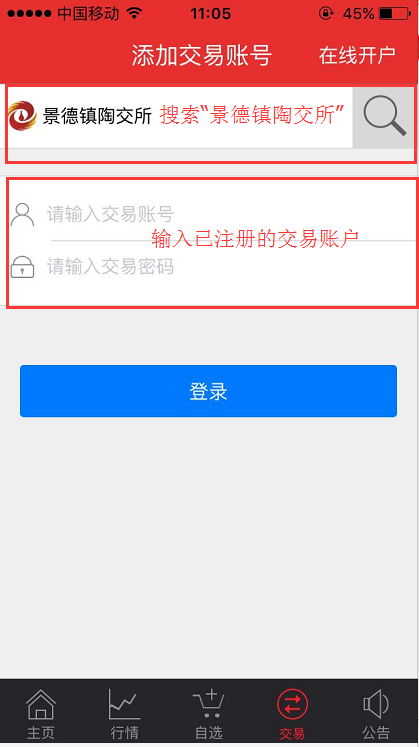 8)步驟八:注冊(cè)“交易賬戶”成功后,返回步驟三,搜索“景德鎮(zhèn)陶交所”并輸入交易賬戶進(jìn)行登錄。