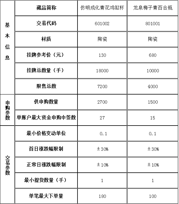 經(jīng)景德鎮(zhèn)陶瓷交易所有限公司(以下稱本交易所)發(fā)行人會員申請,本交易所專家委員會、新藏品掛牌審核小組評估審核通過,對已經(jīng)完成托管入庫的2只藏品仿明成化青花雞缸杯 、《龍泉梅子青百合瓶》準(zhǔn)予在本交易所線上實物交易系統(tǒng)正式掛牌交易,具體事項公告如下: