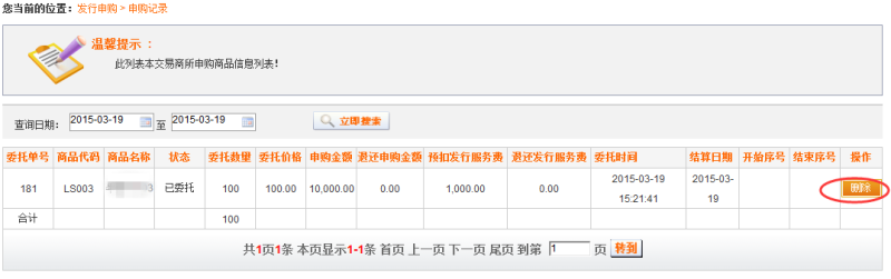 在此界面可以查看交易商的申購信息,可以對其進行刪除,刪除后可重新進行申購。如圖2.1.2-1