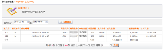 通過該頁面可以查詢到商品已申購成交的情況,包括對應(yīng)商品中簽的數(shù)量、成交價格、申購類型、成交金額、發(fā)行服務(wù)費等信息。