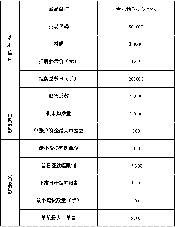 經(jīng)景德鎮(zhèn)陶瓷交易所有限公司(以下稱本交易所)發(fā)行會(huì)員申請(qǐng),本交易所專家委員會(huì)、新藏品掛牌審核小組評(píng)估審核通過(guò),對(duì)已經(jīng)完成托管入庫(kù)的藏品《青龍精紫拼紫砂泥》準(zhǔn)予在本交易所線上實(shí)物交易系統(tǒng)正式掛牌交易,具體事項(xiàng)公告如下: